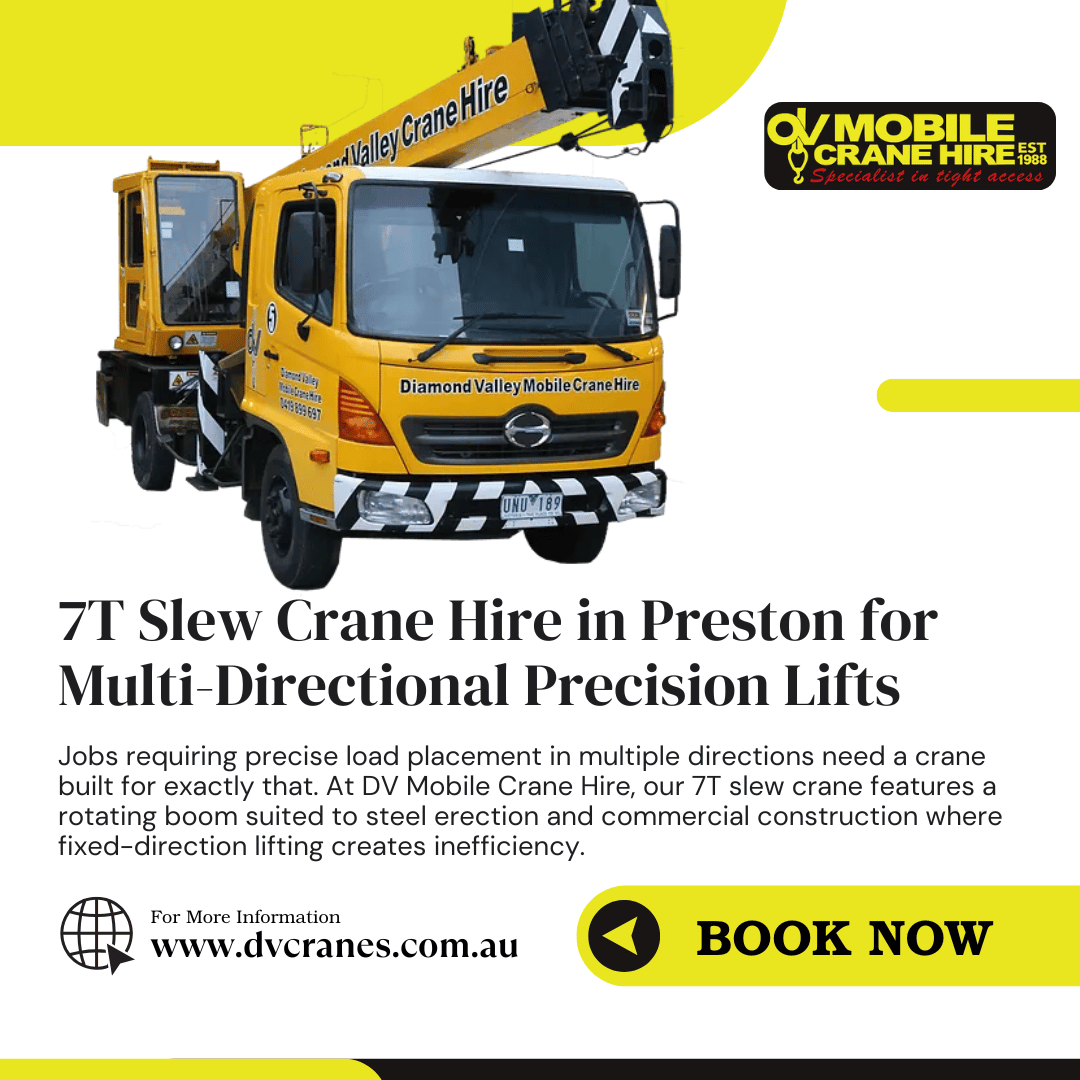 Jobs requiring precise load placement in multiple directions need a crane built for exactly that. At DV Mobile Crane Hire, our 7T slew crane features a rotating boom suited to steel erection and commercial construction where fixed-direction lifting creates inefficiency. Our slew crane service in Preston covers the suburbs and surrounding northern Melbourne areas, with licensed operators and riggers on every booking.
